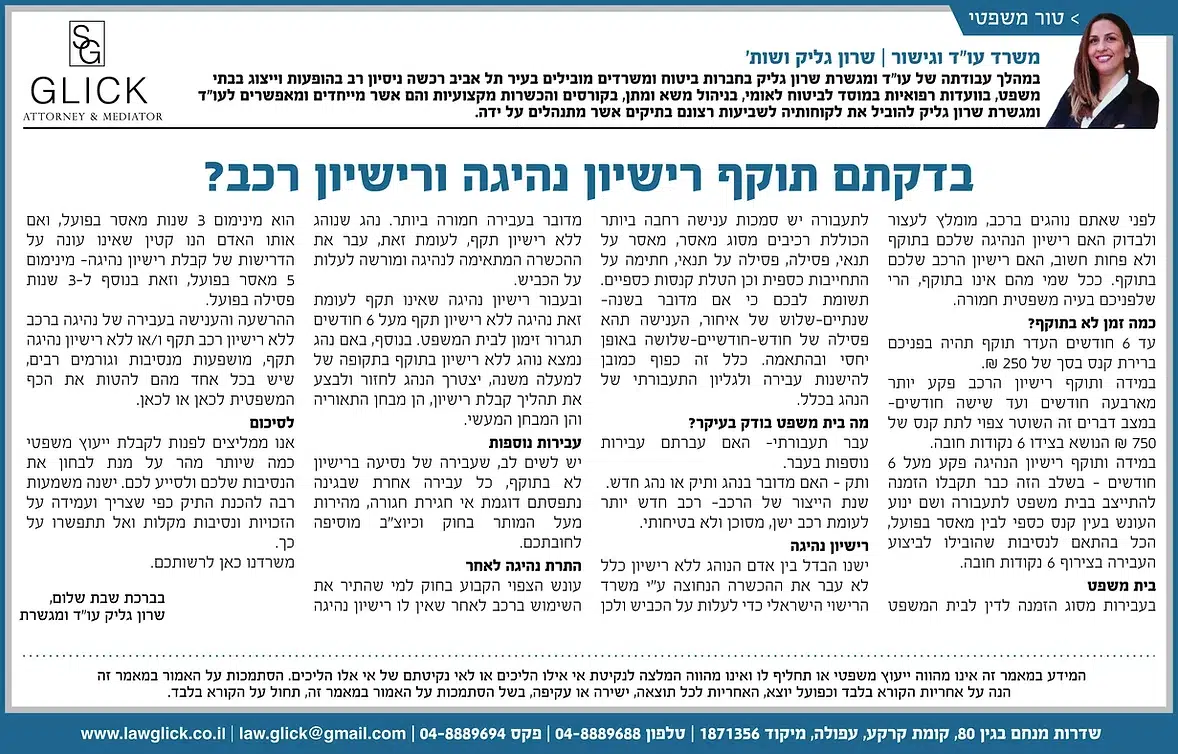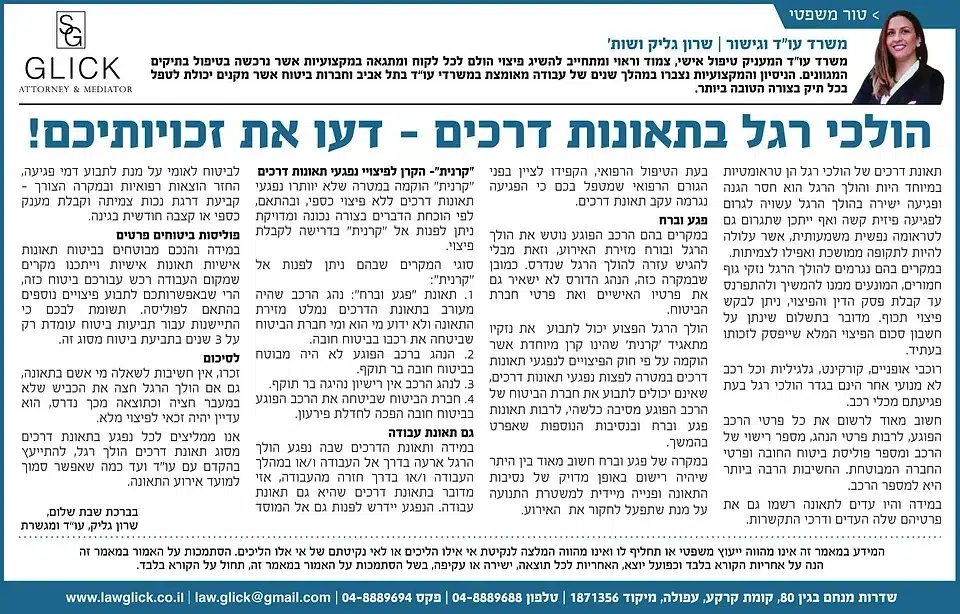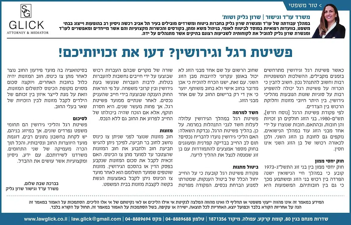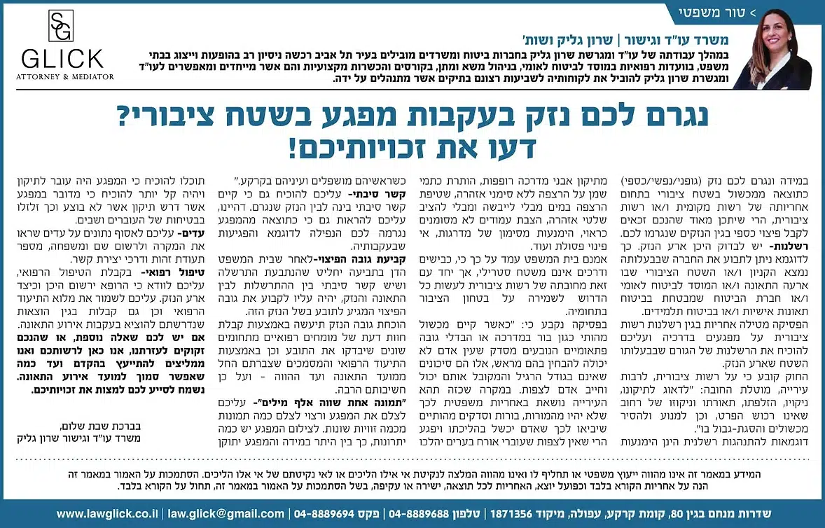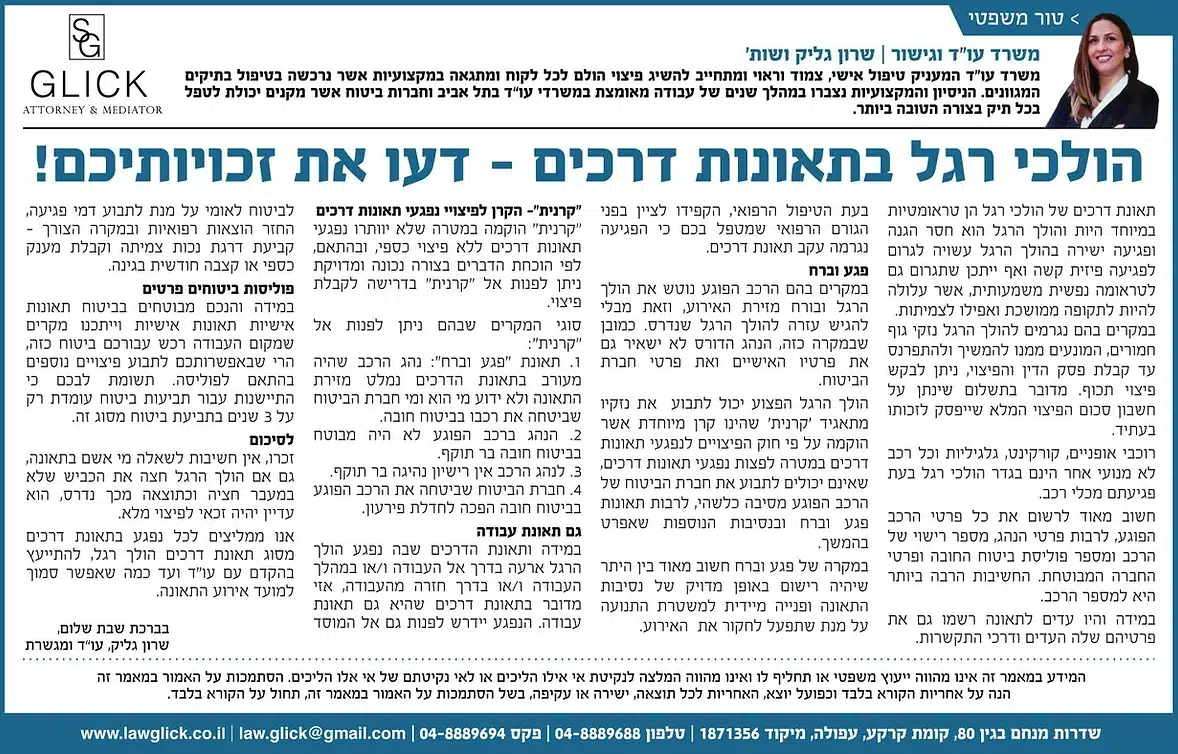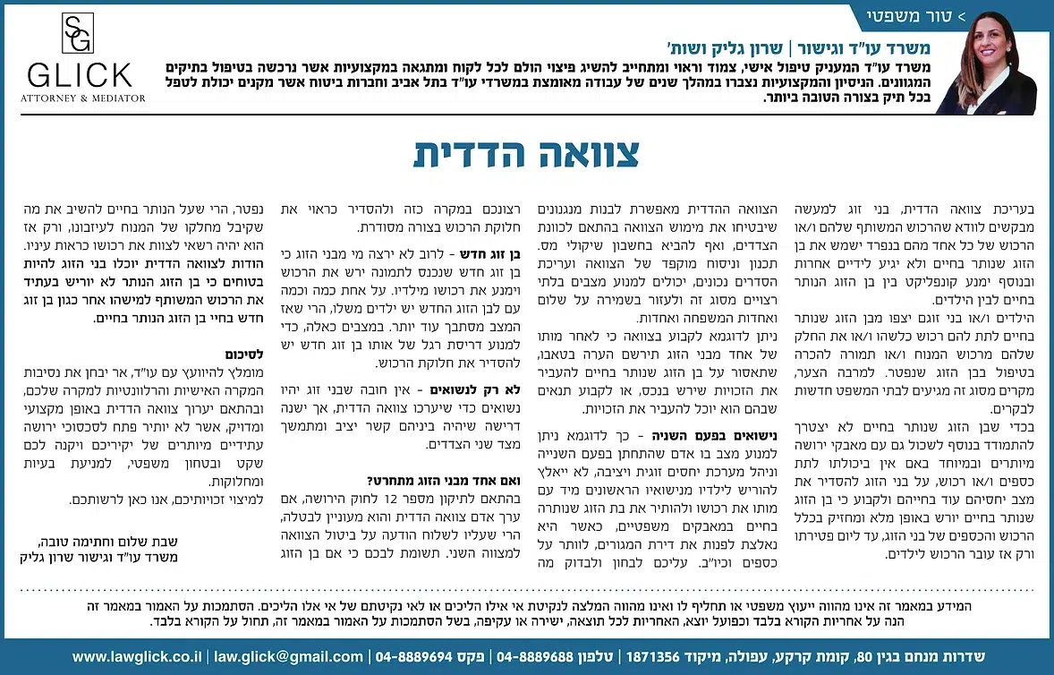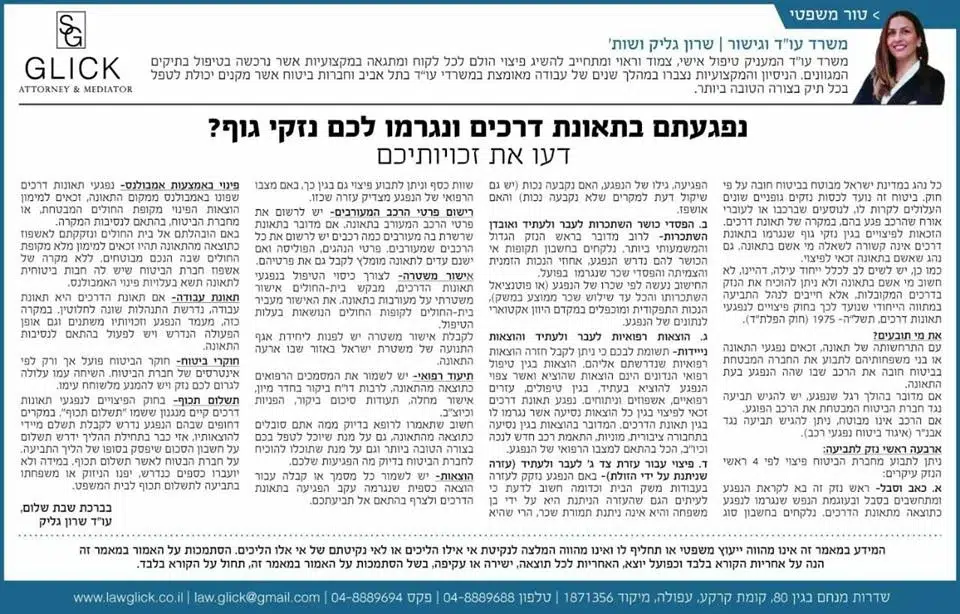 הטור השבועי של עו"ד שרון גליק – כאן תמצאו סדרת פרסומים שהתפרסמו בעיתונות המקומית, עם תובנות משפטיות עדכניות בנושאים שחשובים לכולנו: דיני משפחה, תאונות דרכים, ירושות, ביטוח לאומי ועוד. כל טור מבוסס על ניסיון מעשי ונכתב בגובה העיניים, כדי להעניק לכם ערך אמיתי. מוזמנים לקרוא, לשתף ולפנות אלינו בכל שאלה.