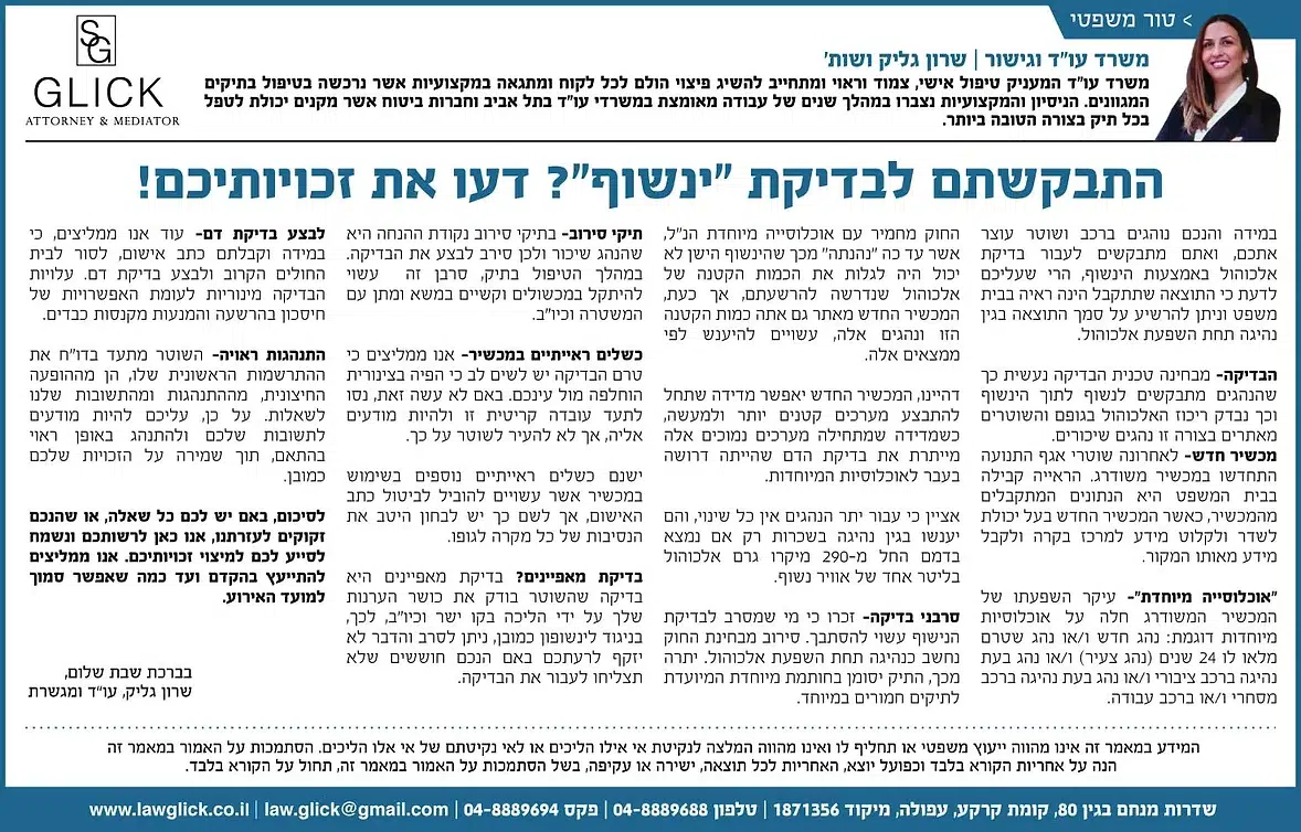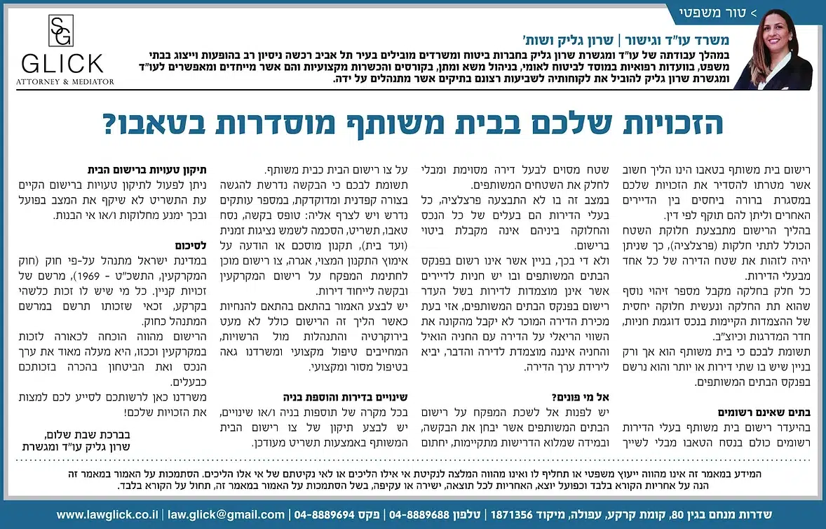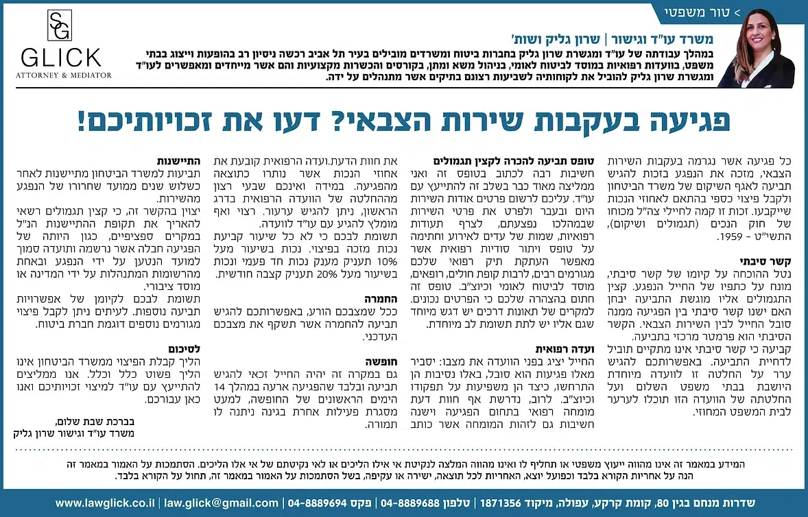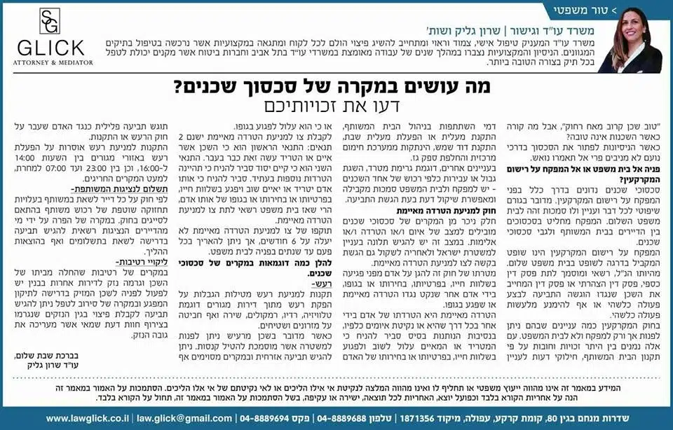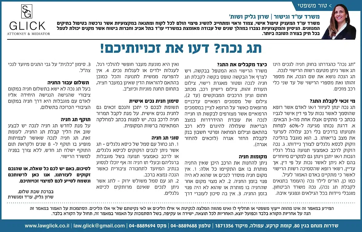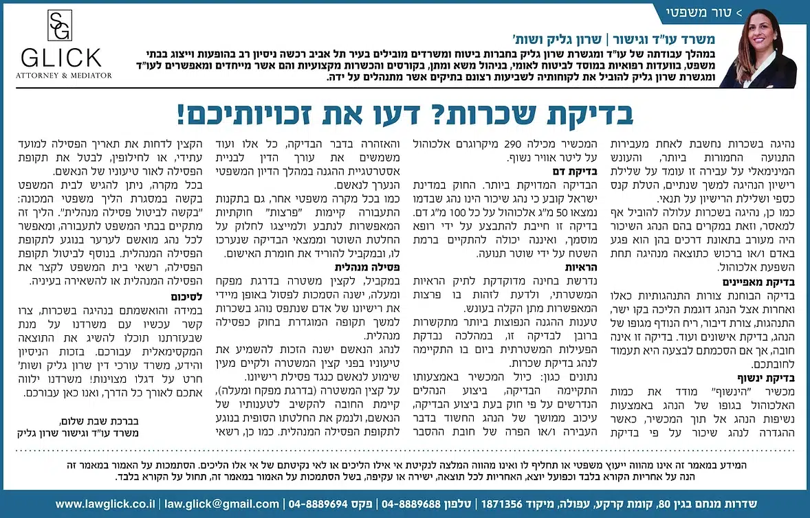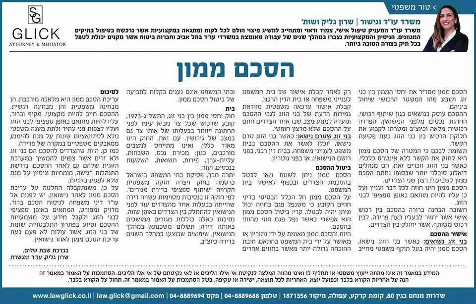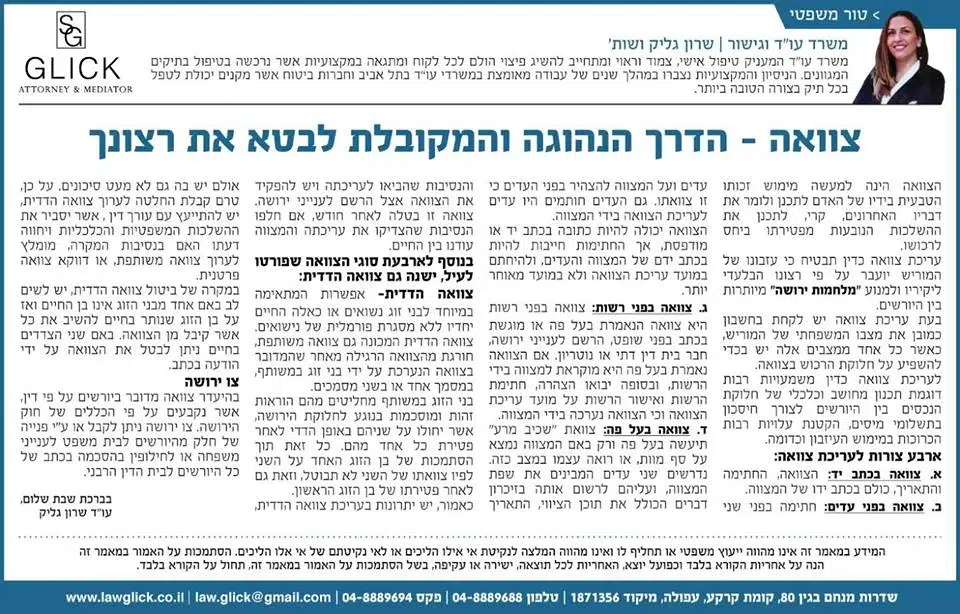 הטור השבועי של עו"ד שרון גליק – כאן תמצאו סדרת פרסומים שהתפרסמו בעיתונות המקומית, עם תובנות משפטיות עדכניות בנושאים שחשובים לכולנו: דיני משפחה, תאונות דרכים, ירושות, ביטוח לאומי ועוד. כל טור מבוסס על ניסיון מעשי ונכתב בגובה העיניים, כדי להעניק לכם ערך אמיתי. מוזמנים לקרוא, לשתף ולפנות אלינו בכל שאלה.