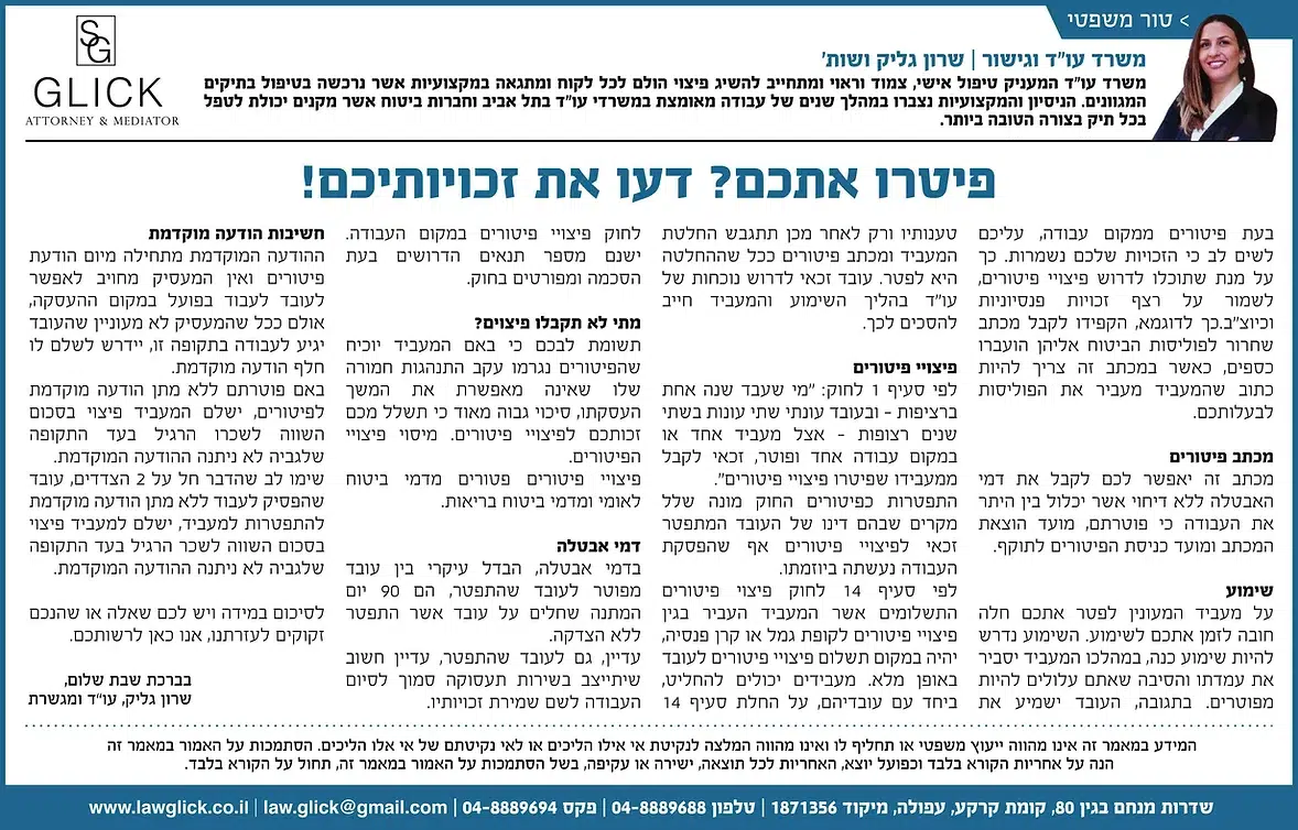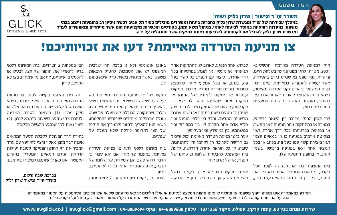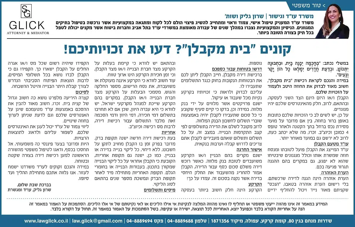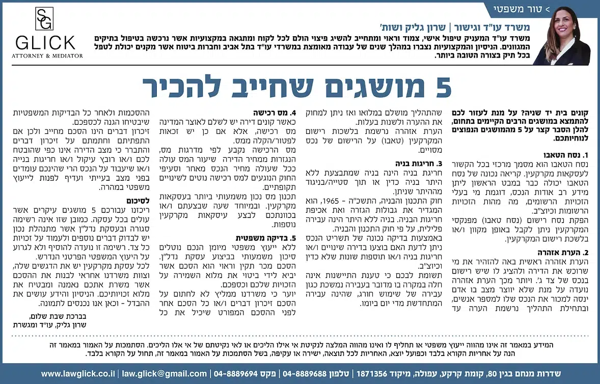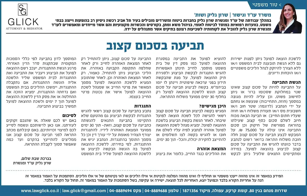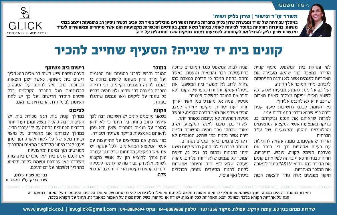 הטור השבועי של עו"ד שרון גליק – כאן תמצאו סדרת פרסומים שהתפרסמו בעיתונות המקומית, עם תובנות משפטיות עדכניות בנושאים שחשובים לכולנו: דיני משפחה, תאונות דרכים, ירושות, ביטוח לאומי ועוד. כל טור מבוסס על ניסיון מעשי ונכתב בגובה העיניים, כדי להעניק לכם ערך אמיתי. מוזמנים לקרוא, לשתף ולפנות אלינו בכל שאלה.